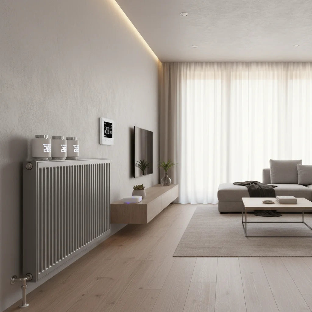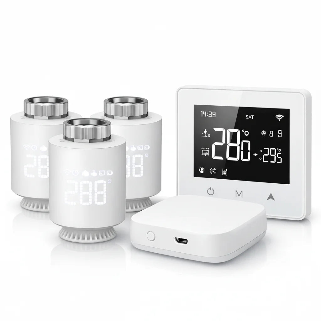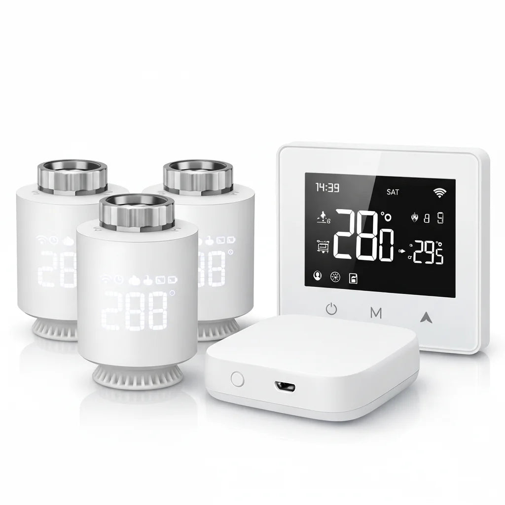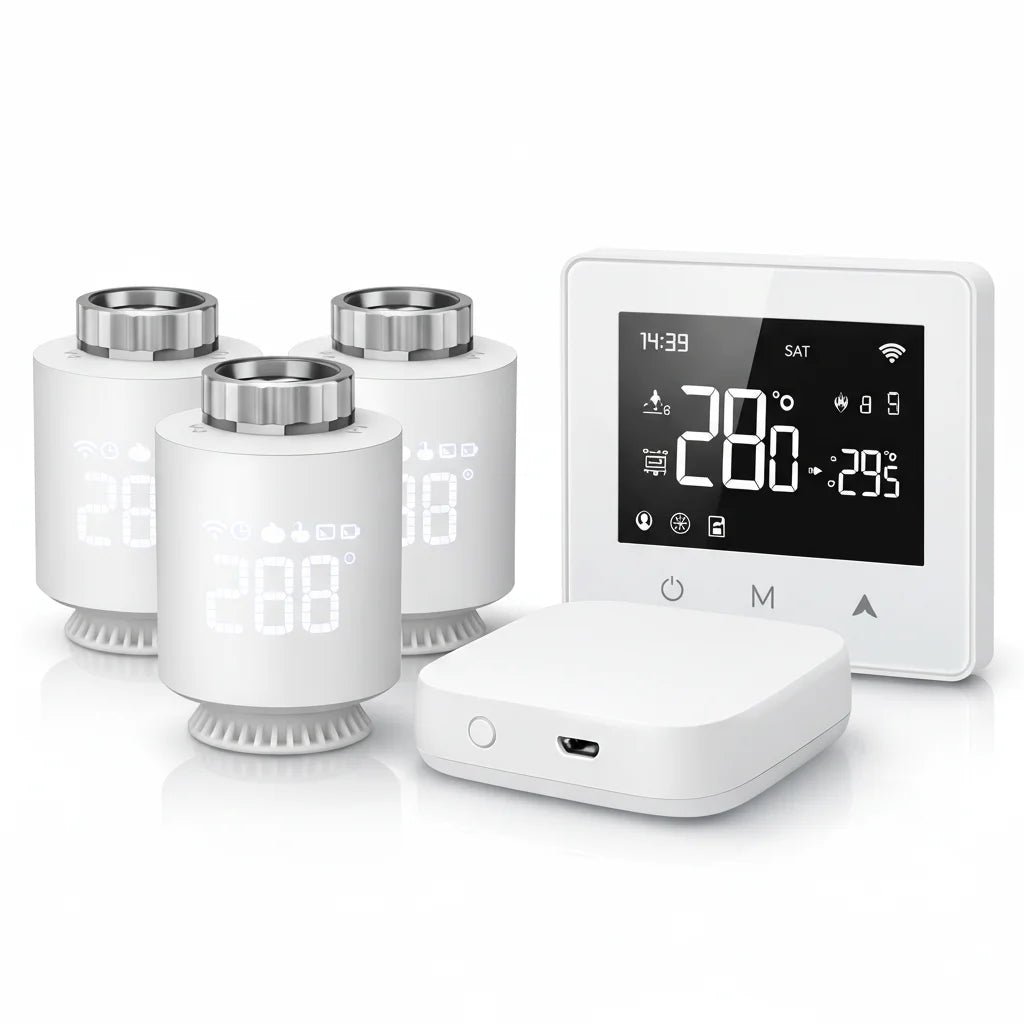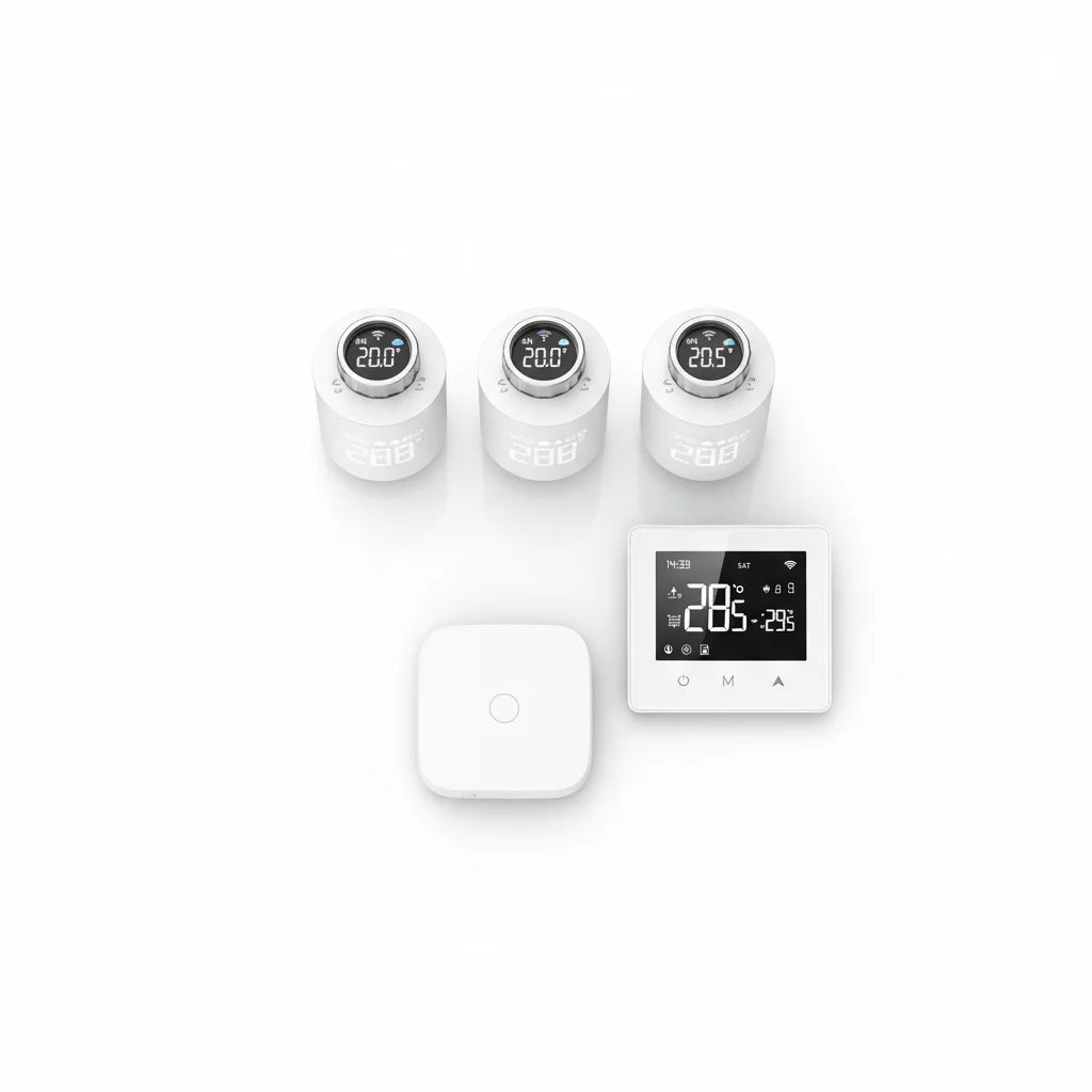 Le Pack Smart Éco est conçu pour s'intégrer facilement à la plupart des systèmes de chauffage existants. Nos têtes thermostatiques s'adaptent à de nombreux radiateurs et le thermostat est polyvalent pour une compatibilité étendue. C'est une solution pensée pour votre foyer.